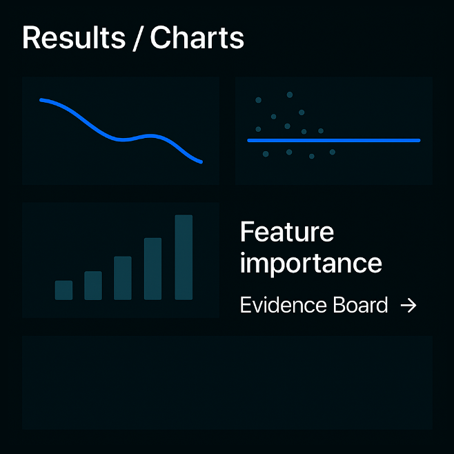 Charts + correlations linked to the Evidence Board; confidence and assumptions are explicit.