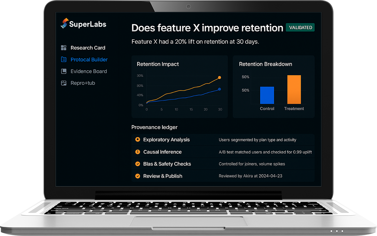 SuperLabs turns messy data into traceable, bias-checked results with explicit epistemic status, ready to ship to your tools.