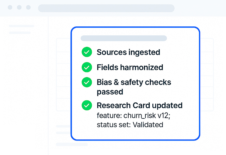 Publish Research Cards/Dossiers/Repro Packs; APIs/webhooks handle downstream updates with optional human review.